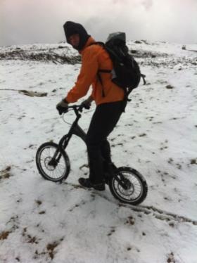 26.09.10: Mountain-Skyver-Tour auf den Simmering mit Tom Scheiring. Wem zum einen das bergaufradeln und zum anderen das bergabgehen zu mühsam ist, für den wurde der Mountain-Skyver erfunden. Die Entwicklung von der skyver gmbh aus Penzberg in Bayern ist ganz neu (www.mountainskyver.com). Es gibt von diesem Gerät 4 Modelle - für mich kommen ja da nur die leichteren Ausführungen in Frage. Dies wäre zum einen das Modell "summit" ohne Federgabel mit ca. 8 kg und das Model "kibo" mit Federgabel mit ca. 8,8 kg (hab ich). Der Skyver kann zusammengeklappt mit mitgelieferten Bändern auf einen herkömmlichen Rucksack geschnallt werden. Allerdings, um so besser das Tragesystem des Rucksackes, um so schonender für Rücken und Schultern. Für mich ist es ja fast weniger anstrengend auf Steigen bergauf zu gehen, als mit dem Bike auf Forststraßen bergauf zu radeln, weil man ja zu Fuß irgendwie besser das Tempo anpassen kann und das Gehen nicht ganz so langweilig ist. Oben wird dann der Skyver einfach auseinander geklappt und dann nach unten gerollt. Wer, wie ich, nicht der Downhiller ist, sucht sich Almen und Berge auf die auch Forststraßen oder einigermaßen fahrbare Steige hinaufführen. Der Schwerpunkt ist ziemlich weit hinten, so dass man relativ entspannt steile Straßen und Wege runter kommt. Allerdings muss man sich erst daran gewöhnen, dass das Gefährt durch die kleinen Laufräder sehr wendig ist, so dass der Lenker gut festgehalten werden muss, um Schläge sofort gegenzusteuern. 8 kg verteilt auf einen guten Rucksack sind eigentlich gar nicht so schlimm - allerdings könnte man den Skyver noch tunen. Wir haben auf alle Fälle eine neue Berggehmethode entdeckt und mir kommt vor, dass diese Erfindung bzw. Entwicklung eigentlich schon längst überfällig ist.