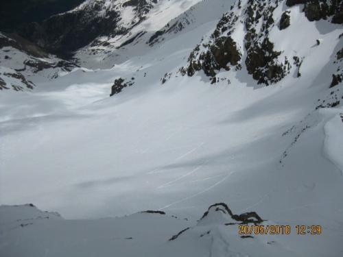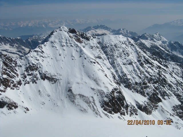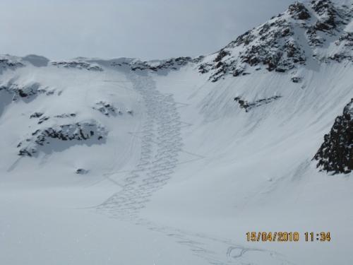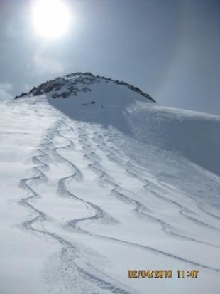 07.04.10: Weißkugelrunde mit Roli Striemitzer - ist halt einfach eine super Runde. Sind um 6:45 Uhr von Melag weg und sind wieder einsam übern Langtauferer Ferner und Ostgrat (bzw. Ostflanke) auf die Weißkugel. Jetzt bin ich schon zum 3. mal hier hinauf gegangen und jedesmal mussten wir spuren - von der Weißkugelhütte wird anscheindend die Weißkugel kaum mehr angegangen - sie liegt wahrscheinlich durch den Gletscherrückgang zu weit oben oberhalb der Moräne. Für mich aber sicher der schönste Anstieg über den noch richtig großen nordseitigen Gletscher und der Ostgrat wird auch so gut wie nie gemacht. Wir sind vor dem Massenansturm aus den südlichen Ausgangspunkten oben gewesen, sind über den Berg drüber und die recht steile Ostflanke abgefahren. Weiter zum Hintereisjoch und mit kurzen Zwischenabfahrten und -aufstiegen rüber zum Äußeren Bärenbartkogel. Hier wartete dann das große Finale, die fast endlose Pulverabfahrt auf dem Freibrunner Ferner auf uns. Mit dem Foto kriegt man nur einen Teil der Abfahrt drauf, außerdem schaut's wie immer ziemlich flach aus. Wir haben auf jeden Fall jeden Schwung genossen. Nach 7 3/4 Stunden waren wir wieder am Auto.