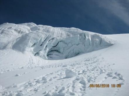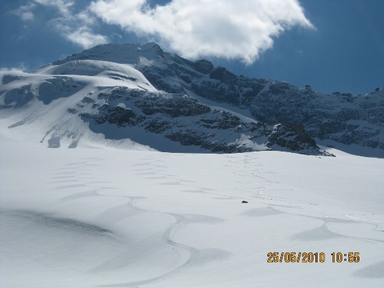 09.05.10: Östl. Feuerstein vom Stubai über Bsuchsalm mit Michael Elsässer. Heute wurde uns endlich schönes Wetter geschenkt. Sind kurz nach 7 Uhr weg und haben bis zur Zwinge getragen. In dieser dann Lawinenknollen, danach mit Felle auf 3 cm Neuschnee auf gefrorenem Altschnee. Vor uns waren 2 Leute und wir konnten bis zum Gipfel in deren Spur gehen. Am Gipfelhang dann ca. 30 cm Pulver - in den letzten Tagen hat es anscheinend immer von Süden geschneit und da haben die Hauptkammgipfel einiges abbekommen. Abfahrt Gipfelhang 1a, danach sind wir gleich direkt steil an der linken Seite den Gletscher runter. Weiter bis zur Zwinge runter war's dann auch noch richtig fein. Durch 30 min. Skitragen haben wir dann die Tour gemütlich ausklingen lassen. Auch bei uns gibt's schöne Eisbrüche.