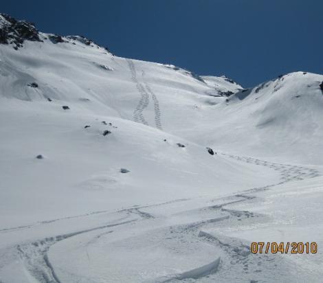 08.04.10: Seeblaskogel mit Rikki: Die Kinder um 7:10 Uhr in den Kindergarten. Am Seeblas schon ziemlich viele Spuren. Bei der Abfahrt um 11:30 Uhr haben wir dann aber meist noch unverspurte Bereiche fahren können. Schnee oben schon schön weich, richtiger Firn war aber erst unten. In den Nordhängen oberhalb 2500 m immer noch Pulver. 09.04.10: Sonnenspitze: Schnee ab Kroten Lack (kurz oberhalb Gluckser Hütte). Oben Martin Kofler getroffen, sind dann gemeinsam die Direttissi runter, wo tatsächlich noch Pulver vorhanden ist.
