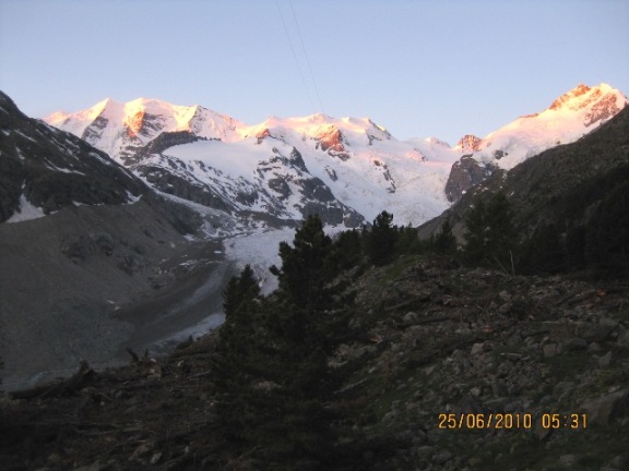 25.06.10: Berninarunde - es ist geschafft: Diese Runde ist mir ja schon lange vorgeschwebt, aber das Wetter musste ja dafür 100%ig passen und so habe ich sie eigentlich auf's nächste Jahr verschoben. Nach dem es ja in den letzten Wochen in der Höhe ständig ganz schön viel Schnee gemacht hat, sind ja oben immer noch gute Verhältnisse. Nach dem Anruf von Michael Elsässer, habe ich mich dann doch noch durchgerungen eine Skitour zu gehen. Um 1:37 Uhr klingelte der Wecker, kurz vor 5 Uhr bei optimalen 2° gingen wir in Morteratsch weg und zwar den Sommerweg auf die Bovalhütte. Der Gletscher ist bis auf Höhe der Hütte schon aper, hier querten wir ihn und kamen dann über die Isla Persa auf den Persgletscher. Auf 2700 m ging's dann immer im Angesicht der herrlichen Palüpfeiler mit Ski weiter. 1 Monat Skitourenpause spürt man dann schon und so waren wir endlich um 9:40 Uhr auf dem Piz Palü Hauptgipfel. Der Grat über dem westlichen Palügipfel (Piz Spinas) war noch unverspurt und so fuhren wir, auch aus zeitlichen Gründen, nach dem Hauptgipfel steil runter nach Süden und querten zur Fuorcla Bellavista. Weil wir ja noch größeres vorhatten, ging's gleich weiter über die Bellavista-Terrasse oberhalb der gewaltigen Abbrüche des Morteratsch-Gletschers. Hier waren auch keine Spuren vorhanden und so brauchten wir eine gute Nase um durch die Brüche im Bereich vom Piz Zupo zu finden. Für die letzten 500 hm auf den Piz Bernina hofften wir auf die 2. Luft - weil man ja auch die Höhe ganz schön spürt. Auch hier war kein Mensch unterwegs und so ging's im ca. 3 cm tiefen Firn mit Ski bis auf ca. 3900 m und dann zu Fuß weiter bei optimalen Verhältnissen mit nur einer kleinen Felspassage auf den Piz Bernina. Um 13:00 Uhr haben wir es endlich geschafft und freuten uns über Michaels 1. Viertausender. Vom Biancograt ist in den letzten Tagen niemand heraufgekommen, weil ja der Übergang vom Piz Bianco zum Hauptgipfel noch ziemlich eingeschneit ist. Um 13:45 Uhr nahmen wir dann die finale Abfahrt durch die berühmte Buuch in Angriff. Ich bin ja hier schon 3 mal durchgefahren, aber das ist schon ewig her und wir waren schon froh, dass eine Spur vom Vortag vorhanden war. Man fährt hier schon durch eine wilde Gletscherszenerie immer direkt unter den Riesenabbrüchen der Bellavista-Terrasse. Einmal gab es eine lauten Knall, aber Gott sei Dank, hat ein Eisturm weit weg von uns den Weg in die Tiefe gesucht. Als wir dann sogar nochmal anfellen mussten, um einigen Riesenspalten auszuweichen, kamen wir dann schon auf dem Zahnfleisch daher - mit dem haben wir nämlich nicht gerechnet. Von oben bis auf 2400 m hatten wir durchgehend 5 cm tiefen Firn, so dass die Abfahrt richtig Spaß machte. Mit Ski fuhren wir dann sogar bis nahezu zum Gletscherende auf 2170 m. Auf dem etwas aufgeweichten Blankeis zu fahren ging nämlich gar nicht so schlecht. Der 40-minütige Fußmarsch zum Auto war auch noch interessant, da hier immer die Gletschstände angeschrieben sind. In den letzten 10 Jahren ist der Morteratschgletscher ca. 300 m zurückgegangen und seit 1900 um sogar 1,87 km. Um genau 16:00 Uhr waren wir am Auto und glücklich über den herrlichen Tag, den wir nicht so schnell vergessen werden. Für mich ist ja eh das Morteratschtal mit Piz Palü, Bellavista und Piz Bernina mit das schönste im gesamten Alpenraum und mit dieser Runde ist uns sicher etwas besonderes gelungen. Das Bild unter hab ich am Morgen aufgenommen - links ist der Piz Palü, in der Mitte die Bellavista und ganz rechts der Piz Bernina mit dem Biancograt.