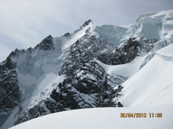 30.04.10: Ortler mit Roli Striemitzer. Als wir heute früh übern Reschen fuhren war es schon ziemlich warm und übern Ortlermassiv waren in der Dämmerung Wolken zu sehen - ob das eine gute Entscheidung war? Sind aber trotzdem um 6:00 Uhr vom Campingplatz in Trafoi gestartet (zu Hl. Drei Brunnen kann man noch nicht hinter fahren) und der Nebel hat sich Gott sei Dank schnell gelichtet. Bei Drei Brunnen fängt dann schon der Schnee an und weil's nachts unten nicht richtig gefroren hat, sind wir den Lawinengraben hinauf. Wir kamen schnell voran und bald waren wir in Höhe der Berglhütte. Ab hier war es dann durchgefroren und alles war bestens. Von oben schauen immer die Eisbrüche des oberen Ortlerfernes auf einen herab - irgendwie hat man da schon ein mulmiges Gefühl. Weiter ging's in Richtung Südosten bis zur Trafoier Eisrinne westlich des Sommerweges. Auf einer alten Spur konnte man diese sogar mit Ski raufgehen - nur in Höhe des Lombardi Biwaks mussten wir ganz kurz über den Fels gehen. Den obere Ortlerferner hatte ich viel flacher in Erinnerung, aber bei guter Pulverauflage ging es auch hier schnell nach oben. Hier kamen uns 2 Leute entgegen, die von Süden die direkte Minnigeroderinne rauf sind (ich bin ja im März 2003 auch schon mal, allerdings die etwas zahmere Haupt-Minnigerode rauf, dafür mussten wir uns damals mit dem oberen Hintergrat bei winterlichen Verhältnissen abkämpfen). Am Gipfel genossen wir die Aussicht auf die gewaltigen Berge um uns herum und saßen eine Stunde oben. Lt. Gipfelbuch waren heuer im Winter ca. 20 Leute oben. Wir haben heute wirklich super Verhältnisse erwischt und Steigeisen und Pickel konnten im Rucksack bleiben. Um 11:00 Uhr nahmen wir dann die 2300 hm Abfahrt in Angriff. Oben war's schön pulvrig, die steilsten Bereiche bei der Trafoier Eisrinne waren allerdings noch hart (bis die weich werden, bis dahin würde man unten dann versumpfen), aber wir kamen mit Ski gut durch. Danach war es bis zur Berglhütte optimal aufgefirnt. Die Abfahrt nach der Hütte war dann schon weich, aber wir kamen eigentlich ganz gut runter. War heute ein super Tag und wir waren von der stark vergletscherten Nordseite des Ortlers mit den vielen Eisbrüchen sehr beeindruckt - da kommt man sich selber ziemlich klein vor. Im Bild unten die momentan ziemlich eisige Ortler-Nordwand.
