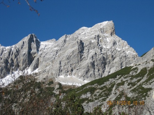 06.11.10: Haller Roßkopf mit Roli Striemitzer. Nach der Wettervorhersage, haben wir wieder unser Saisonziel erreicht, als letzter in diesem Jahr im Gipfelbuch zu stehen. Bei 2° um 7:30 Uhr von Sistrans mit dem Rad weg und mit Roli rein ins Halltal in die Schinder-Auffahrt bis zum Issanger. Dann endlich in der Sonne und übern Wilde-Bande-Steig zum Einstieg Südostgrat gleich rauf über die untere Steilstufe. Hier dann kaum Schnee und schön warm bis zum schönen Gipfel (unten - links im Bild die Kälberkarkante). Der Übergang zur Stempelspitze dann im Schnee. Die Stempelreise ebenfalls im Schnee und mit Rädern immer noch bei nur 4° im Halltal wieder heim. Kälter darf's im Halltal nimmer sein, da sonst Glatteis. Ich musste dann wie immer noch nach Sistrans rauf.