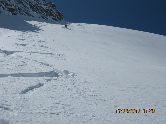 18.04.10: Sonnenspitze, jetzt sind bis Halsmarter nur mehr Schneereste vorhanden - danach geht's noch ganz gut. Gipfelhang oben an Nordwestseite noch pulvrig. Direttissi, im oberen Teil leichter Deckel, weiter unten ist dann der Deckel tragfähig und unter 2150 m hat's leicht aufgefirnt. Piste um 12:30 Uhr optimal aufgefirnt.