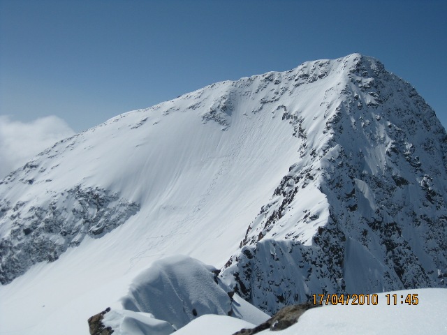 22.04.10: Ruderhof und Östl. Seespitze: Aufstieg Ruderhof vom Stubaital über Nockgrube und Grawawandferner - man muss an den Südhängen schon bis 2100 m die Ski tragen. Alles unberührt und jungfräulich, allerdings kam heute auch vom normalen Südanstieg niemand herauf. Heute auf der ganzen Tour keine Menschenseele gesehen. Bin dann die Ruderhof-Nordflanke abgefahren (auch alles unberührt). In der Wand ist teilweise nicht allzuviel Schnee vorhanden - bin bei der Querung ein Stück über's Eis gerattert. Man soll halt doch nur dort steil runter fahren, wo man auch rauf gegangen ist. Weil ich noch Zeit hatte, bin ich noch von Süden auf die Östl. Seespitze übern Südwesthang und den Südgrat - alles gestapft, weil mit Felle zu hart. Hier bin ich dann die ganz schön lange und auch nicht gerade flache Südostrinne mit Ski runter, wo es schon leicht aufgefirnt hat. Danach musste ich noch von Norden auf's Grawagrubennieder. Hier war alles pulvrig mit teilweise Grieseleinlagen, so dass ich hier teilweise nur mehr mit Ski höher kam. Anschließend dann die super Firnabfahrt in der Nockgrube und die letzten 400 hm die Ski zum Auto getragen, das hat mir aber nix ausgemacht, weil's ja doch eine lässige Runde war. Das 1. Foto ist die Ruderhof-Nordflanke von der Östl. Seespitze aus - habe oben ein paar Schwünge gemacht und bin dann im Bild nach rechts rübergequert. Unten das 2. Foto die Östl. Seespitze von der Ruderhof - die Südostrinne zieht vom Gipfel nach rechts unten weg.