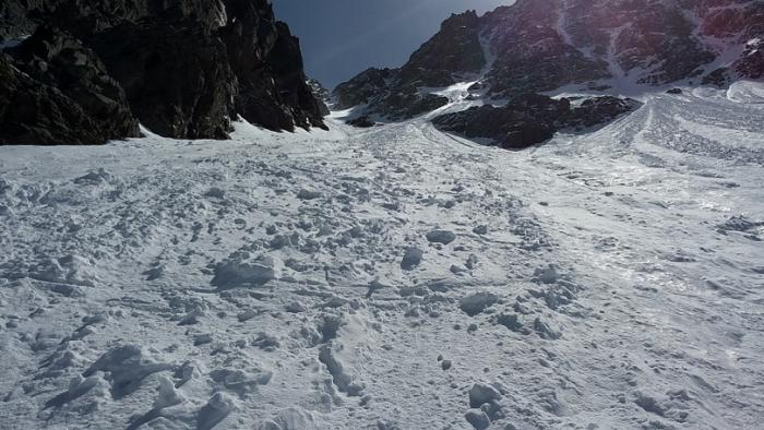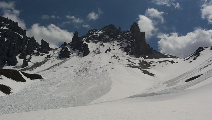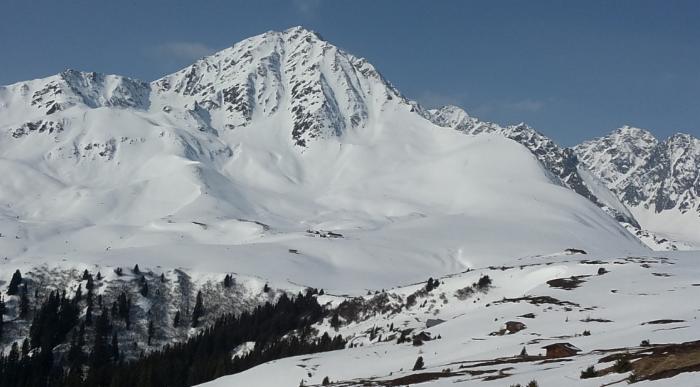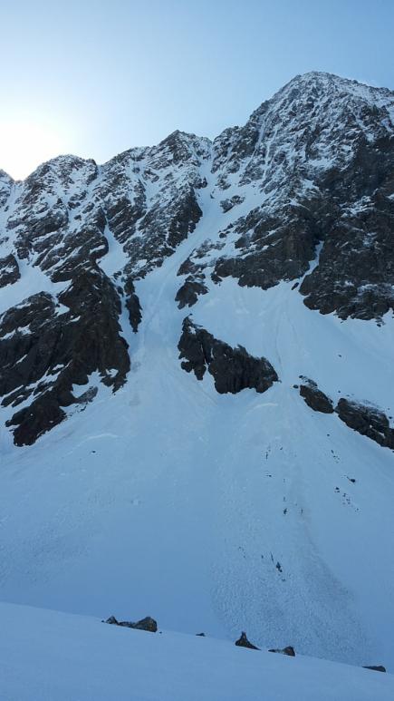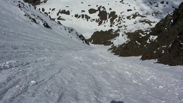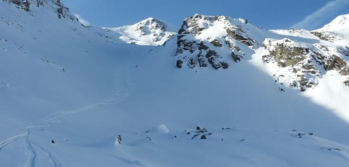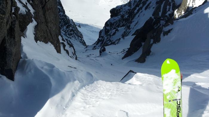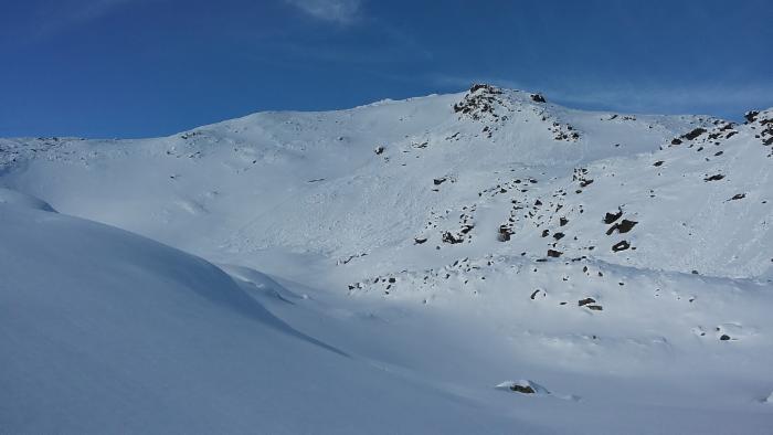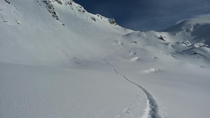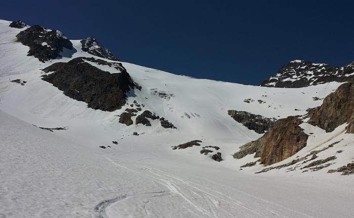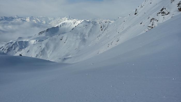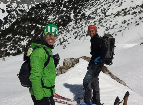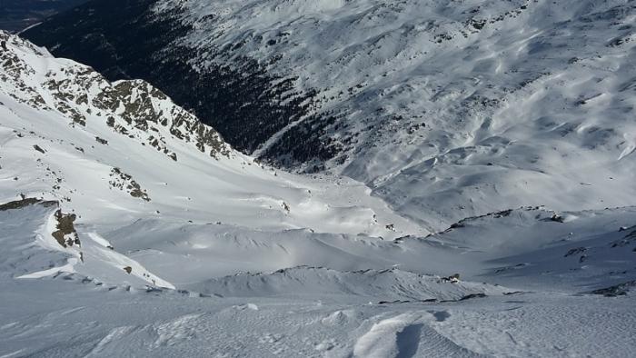 Bin dann oben im schönen Pulver die Südflanke runter. Endlich mal wieder Pulver, weil die letzten Wochen bin i bloß im Windpressschnee rumgegurkt. Weiter unten war der Pulver durch die Sonnenstrahlen nicht mehr flockig, aber trotzdem noch ganz gut fahrbar. Unten im Lastschengürtel bin ich zwar mit Ski durchgekommen, aber es war nochmal ziemlich nervenaufreibend, weil man immer wieder hängen bleibt und sich dann wieder mühsam befreien muss.