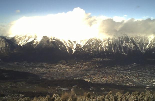13.01.15: Sonnenspitze und Glungezerhütte: Ab der Gluckserhütte beginnt die dünne Schneeschicht, die dann die teilweise eisige Altschneedecke bis Halsmarter eigentlich ganz gut überdeckt. Ab Halsmarter ist präpariert und die Piste in einem überraschend guten Zustand. Oben ab der Schaferhütte hat's den wenigen Neuschnee der letzten Tage total verblasen - die Gefahr auf Steinkontakt in der Normalroute ist jedoch nach wie vor gering. Hüttenwirt Gottfried freut sich auf Gäste. Nachfolgend ein Foto aus der Kofel-Schutzhaus-Webcam vom 11.01.15 - "Die Nordkette brennt":