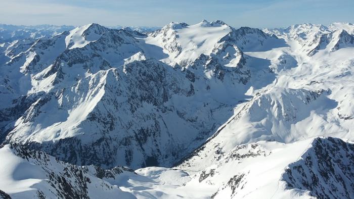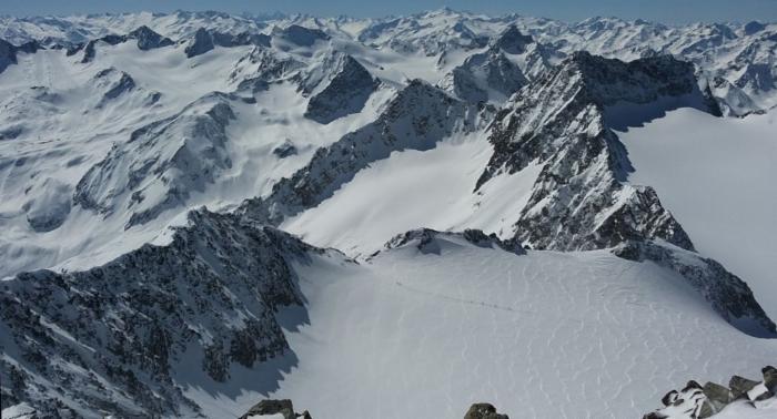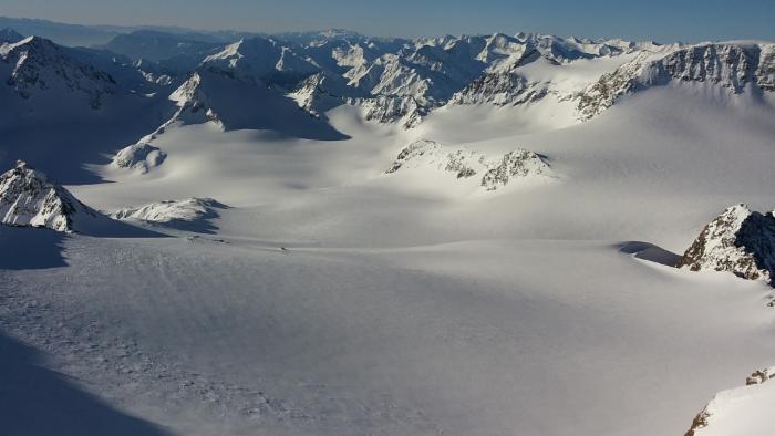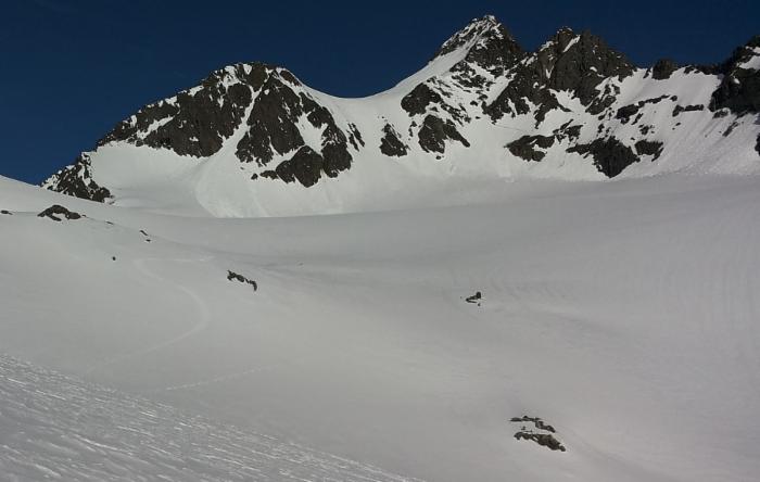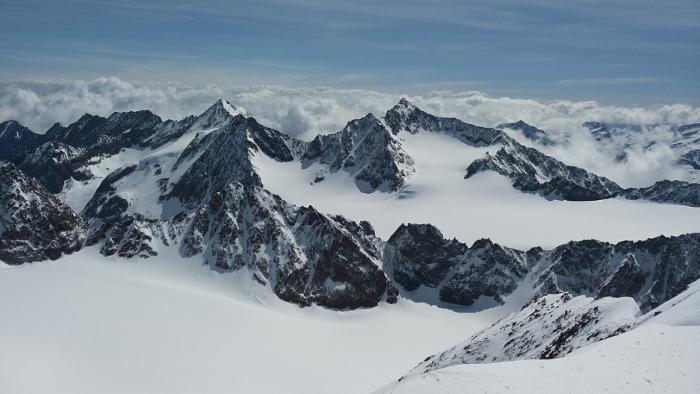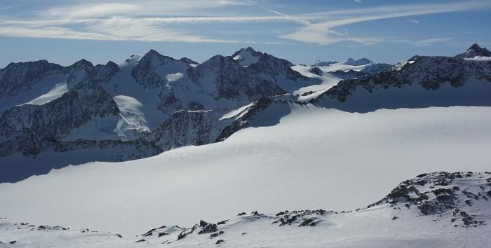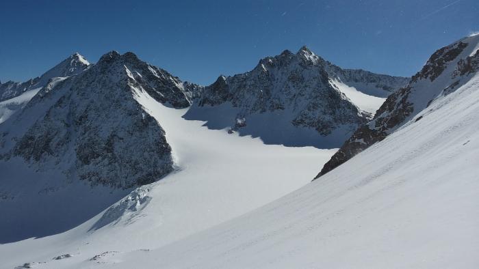 Die Tage vorher muss es aber hier wild geblasen haben, weil der Schnee schon teilweise zu Eis gepresst war. Auf dem Foto sieht man rechts die Sonnklarspitze, links den Botzer und dazwischen den völlig unberührten Übeltalferner – viel los ist hier offensichtlich noch nicht.