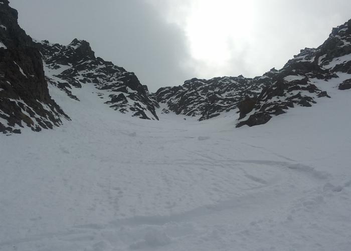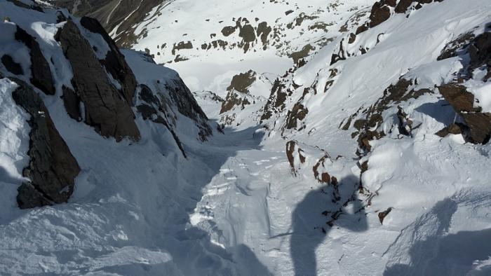 Um dann rüber zum Längental zu kommen, musste ich mich äußerst mühsam zuerst auf ein Joch hinaufwühlen. Als ich endlich oben war und zur anderen Seite hinunter schaute (mittleres Foto), riss ein Windstoss meinen linken Handschuh weg und er sauste die gesamte Rinne hinunter (mittleres Foto). Saublöd, sowas ist mir eigentlich noch nie passiert. Mit nur einem Handschuh ging's dann dort hinunter im oft ziemlich windgepressten Schnee, dabei hab ich immer wieder die linke Hand in der Hosentasche aufgewärmt. Unten im Rinnenauslauf hab ich dann den entwischten Handschuh wieder finden können – da hab ich mal wieder Glück gehabt.