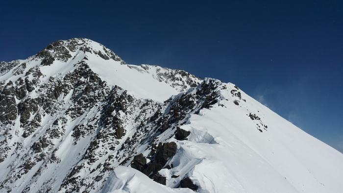 Bin dann ziemlich mit den Ersten von den Leuten, die heute von Franz-Sennhütte aufgebrochen sind, am Alpeiner Ferner gestanden. Habe ehrlich gesagt schon gehofft, dass die schon ein bissl weiter sind – so musste halt ich wieder spuren. Bis zur oberen Hölltalscharte war Rückenwind, aber dann am Südwestgrat kam er voll von der Seite. Der Fels-Schnee-Grat ist ja eigentlich leicht, aber der tiefe Schnee und der starke Wind hat dann die Sache doch etwas erschwert. Bin dann dort bald mit Ski weiter, weil man ja mit den Brettern nicht so tief einsinkt. War dann echt heilfroh, als ich auf der Ruderhof oben gehockt bin.
