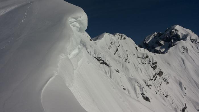 Die Abfahrt nach Süden ist dann zuerst ziemlich steil und dort hab ich schon genau schauen müssen, wo ich runter fahre. Aber im flacheren Gelände war’s einfach zu viel Neuschnee zum Skifahren, so war auch das Runterfahren recht anstrengend.