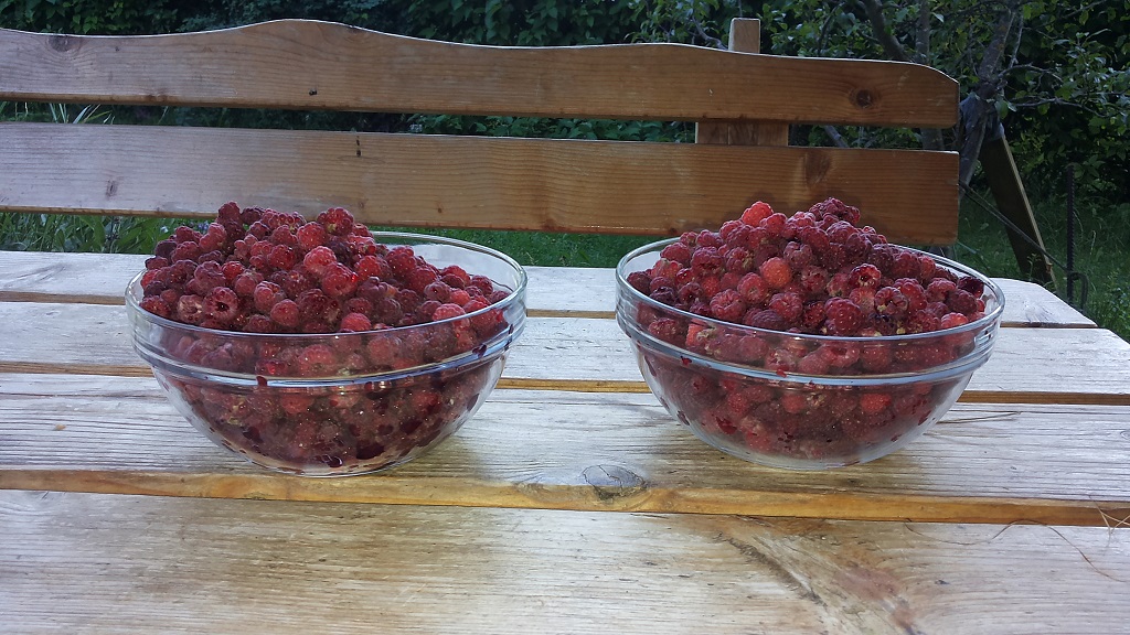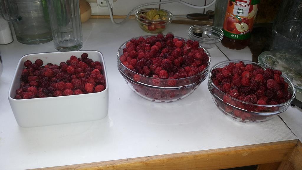 21.08.16: Viggarspitze: Heute war kein Rennradwetter. Weil's nur wenig Moosbeeren gibt, bin ich auf Himbeeren umgestiegen. Die gibt's bei mir im Wald heuer massenweise - heute besonders große gezupft. Die Zubereitungsmöglichkeiten sind allerdings etwas eingeschränkt.