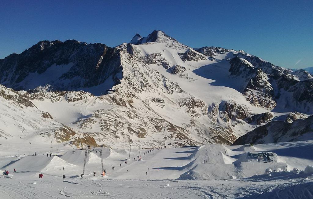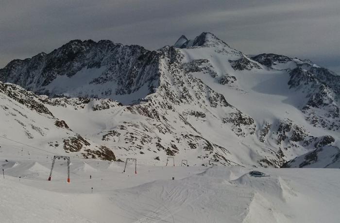 Retour ging's dann die Windgangln-Abfahrt bis zum Pfaffenjoch und weil wir ja zur Wilde-Grubn-Abfahrt wollten, fuhren wir noch weiter runter den Pfaffenferner bis auf ca. 2750 m. Es ist schon erschreckend, wie wenig Schnee hier liegt - am Pfaffenferner auf Höhe ca. 3000 m auf ca. 40 Höhenmeter schaut viel Blankeis hervor, dort muss man genau schauen, wo man runter fährt. Danach wieder angefellt und gute 400 hm rauf auf's Eisjöchl, wo wir mitten in den Skifahrer-Massen waren. Die Pisteabfahrt bis Gamsgarten gemeinsam mit hunderten (oder tausenden) von Skifahrern war dann von den Schneebedingungen her ziemlich angenehm.