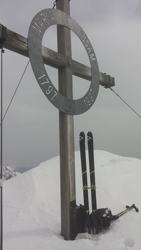 Bis zum Juchezer ging‘s schneefrei zu Fuß hinauf, danach mit Ski weiter. Es war zwar nur oberflächlich gefroren, aber ich Leichtgewicht bin nur wenig eingesunken - kam eigentlich ganz gut voran. Oben am Gipfelhang ging ich auch viel mit Ski, weil für's Stapfen war i doch wieder etwas zu schwer. Um kurz vor 11:00 Uhr war i dann oben. Laut Gipfelbuch heuer der erste mit Ski. Unten ein Foto mit Gipfelkreuz und meinem Fischer-Verticalp (https://www.fischersports.com/at_de/fischer/alpine/tour), der im Gelände gar nicht mal so schlecht zu fahren ist – bin richtig verliebt in das Skilein. Ein Gipfelbucheintrag war von Benedikt Purner am 18.03. – er machte anscheinend eine 3-Tages-Winter-Karwendelüberschreitung.