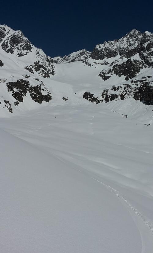 Deshalb sind Stefan und ich dann den Freiger Ferner hinunter gepulvert - war echt ein Gedicht. Eigentlich wollten wir über die Sulzenau hinunter ins Stubaital. Dann ist uns aber eingefallen, dass wir vom Grünsee aus auf die Seescharte raufgehen und ostseitig hinunter in unser Aufstiegstal abfahren könnten. Das war die beste Idee des Tages – wie das obere Foto zeigt, ist die Bergkulisse zur Seeschafte hinauf besonders schön (Freiger-Ferner, wo wir abgefahren sind) und wahrscheinlich verirrt sich im Winter dort hin ganz selten jemand.