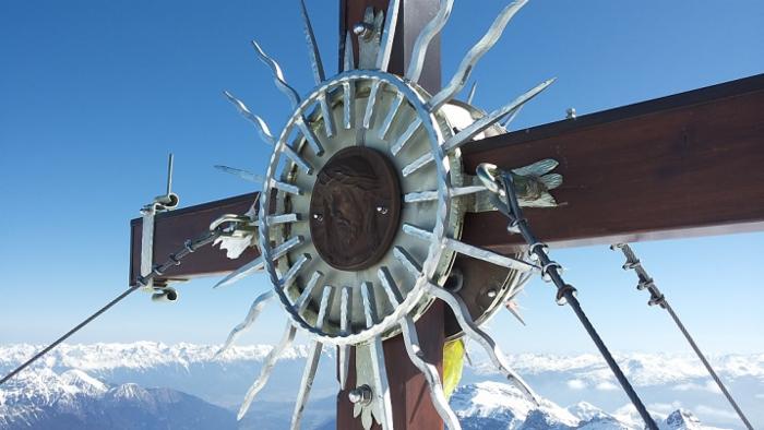 Unten das obere Foto mit dem schönen Gipfelkreuz, beim mittleren Foto blicke ich von unten hinauf in die bei mir noch harte Rinne und unten Firn so weit das Auge reicht.