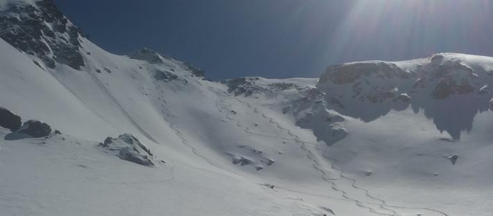 Ostseitig hinunter haben wir erst etwas suchen müssen - haben aber dann nordostseitig teils zwischen den Felsen ganz gut hinunter gefunden. Bis hinunter zur Bsuchsalm hatten wir 10 cm tiefen Firn, der ganz gut fahrbar war.