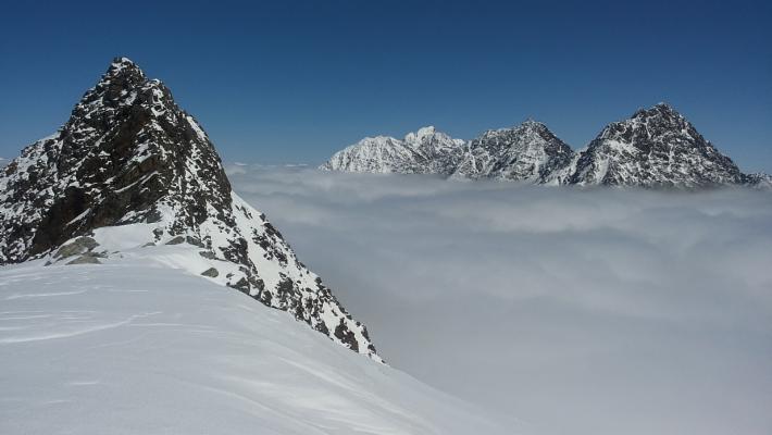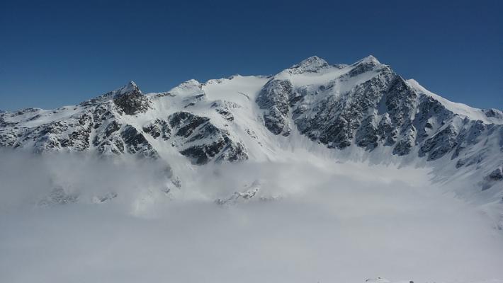 Übern Nebel war's dann herrlich und am Freigergipfel hatte ich Zeit die Welt um mich herum zu genießen. Über die Sulzenauhütte kam Thomas Salchner mit einem Kollegen heraufgespurt. Hier hat der Pulver besonders verlockend ausgeschaut.
