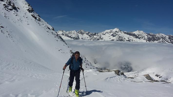 10.04.16: Freiger und Seescharte mit Stefan Gordon: Endlich mal gute Verhältnisse. Sind vom Parkplatz der Bsuchsalm gestartet. Das Spuren war nicht schwer, weil der Schnee oberhalb der Bsuchsalm meist gefroren war, erst über 2200 m wurde es dann pulvrig. Gut, dass ich dort nicht das erste Mal raufgehe, weil bis ca. 2750 m waren wir im recht dichten Nebel unterwegs und wir hatten schon Zweifel, ob wir überhaupt aus der Nebelsuppe herauskommen. Von der Nürnberger Hütte kam dann eine Spur von gestern daher - leider sehr steil und eingeblasen.