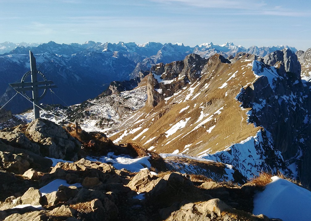18.12.16: Viggarspitze: Gestern bin i mit dem Rad nahezu schneefrei bis zur Iss auf knapp 1900 m gefahren. Heute bin i zu Fuß rauf und gleich weiter auf's Viggarspitzl. Zwischen 2050 und 2200 m, weil nordseitig, liegt noch Altschnee, aber die letzten 100 hm am westseitigen Gipfelhang sind wieder schneefrei.