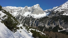21.04.16: Gr. Seekarspitze: Wollte eigentlich, wie jedes Jahr, die Karwendelreib’n machen. Bin mit dem Radl von Scharnitz bis kurz vor die Angeralm hinter, von dort zuerst zu Fuß und dann mit Ski ins Neunerkar und weiter auf die Gr. Seekarspitze. Unten war alles gut durchgefroren und über ca. 2300 m war’s pulvrig mit teils leichter Kruste und auch teils etwas windgepresst.