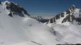 26.03.16: Glungezer von daheim: Weil's in der Früh noch ziemlich grauslig war, hab ich keinen rechten Auftrieb gehabt. Da das Wetter nur zögerlich besser wurde, ist mir mal wieder nix besseres als der Glungezer eingefallen. Den Parkplatz-Stress am Tulfer Berg mag ich gar nicht und so bin i von daheim weg. Mit dem Radl bin i nit weit gekommen und zu Fuß ging's dann durch den Wald bis ca. 1300 m. Bis zur Kalten Kuchl war dann Spuren auf den Forstwegen angesagt. Beim weiteren Anstieg hab ich dann immer wieder die sehr verlockende Direttissi beobachtet - hm, allerdings sind dort immer wieder kleine Schneerutsche abgegangen. Hab mich daraufhin für den Glungezer und den Osthang entschieden, auch weil mir auf der Sonnenspitze zu viel los war. Beim Spuren auf den Glungi, die letzten 250 hm, hat sich der Schnee unter mir immer wieder gesetzt, weil der Neuschnee ziemlich vom Wind beeinflusst war - heute heißt's also besonders aufpassen (drum ist selber spuren, nie ein Fehler). Gut, dass der Osthang vom Gipfel bis runter auf 2500 m nicht besonders steil ist und danach war dann der Schnee schon stabiler gelagert und so war der Osthang m. E. schon vertretbar und auch gut zu fahren. Unten auf der Piste, sah ich dann, dass die gesamte Direttissi infolge Selbstauslösungen aus den Felsen heraus eingelahnt war und zwar genau dort, wo ich eigentlich immer runter fahre. So ein Anblick macht dann schon nachdenklich. Leider hab ich nix zum Fotografieren dabei gehabt. Viele Skifahren haben Fotos gemacht - vielleicht liest ja jemand das und es wäre sehr nett, wenn man mir ein Foto mailen würde - Danke richioben@hotmail.com. Danke Alfred Platzer (www.brennstueberl.at) und Christian Maier, dass ihr mir Fotos geschickt habt - hoffe, ihr seit einverstanden, wenn ich eins auf die Seite tue. Nach sehr viel Schnee schaut's auf dem Foto zwar nicht aus, aber das könnte schon reichen - mir ist's jedenfalls eine Warnung.