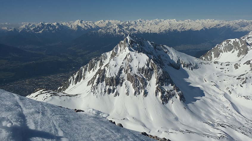 Zuerst wollte ich südostseitig ein Stück die Kesselreise runter, weil die aber schon zu weich war, bin i wieder die Nordrinne runter. War zwar um 11:15 Uhr immer noch ein bissl hart und teils verknollt, ging aber trotzdem ganz gut. Beim Rückweg Richtung Stempeljoch hab i no einen Abstecker auf die Thaurer Jochspitze gemacht.