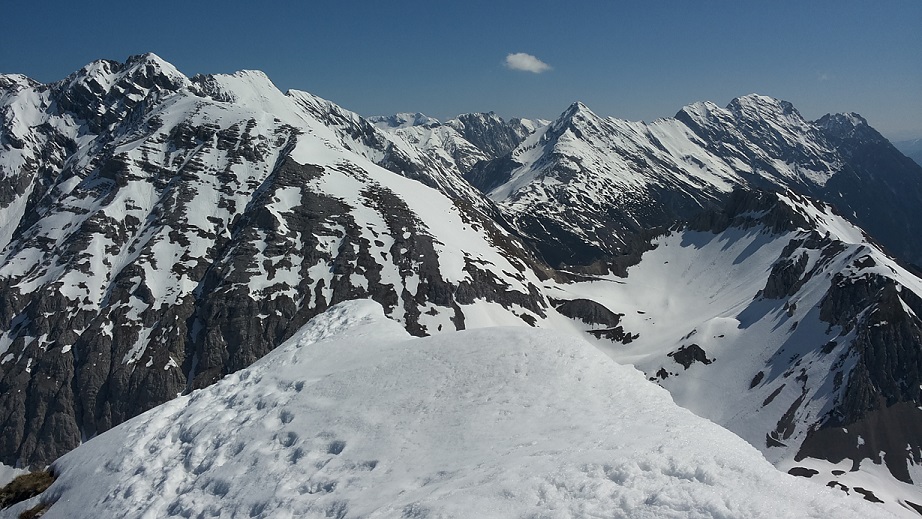 21.04.16: Gr. Seekarspitze: Wollte eigentlich, wie jedes Jahr, die Karwendelreib’n machen. Bin mit dem Radl von Scharnitz bis kurz vor die Angeralm hinter, von dort zuerst zu Fuß und dann mit Ski ins Neunerkar und weiter auf die Gr. Seekarspitze. Unten war alles gut durchgefroren und über ca. 2300 m war’s pulvrig mit teils leichter Kruste und auch teils etwas windgepresst.
