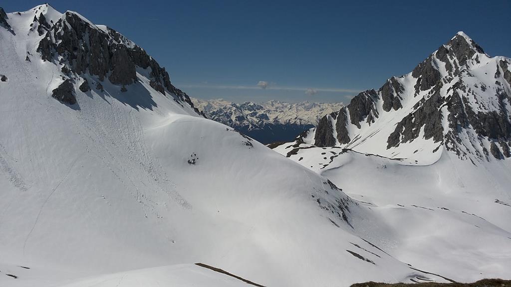 Ostseitig hinunter haben wir erst etwas suchen müssen - haben aber dann nordostseitig teils zwischen den Felsen ganz gut hinunter gefunden. Bis hinunter zur Bsuchsalm hatten wir 10 cm tiefen Firn, der ganz gut fahrbar war.